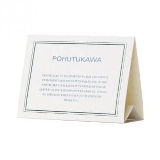 Front: Please help us to conserve water and energy by hanging your bath linen for re-use. If you would like your bath linen replaced please leave it in the bath or shower cubical. It will be replaced when your room is serviced. Thank you. Back: Epitomizing the green image of New Zealand, all the Pohutukawa hair & skin care products contain either Manuka oil, Manuka leaf and/or Lanolin. Needless to say, all our shampoos, conditioners, body wash, moisturisers & soaps are made right here in God's Own. Made in New Zealand, Bio degradable, Free from animal or petrochemical by-products, Made from a 100% vegetable base, GE Free, Tested on humans, not animals, Printed on 100% recycled, oxygen bleached cardboard.